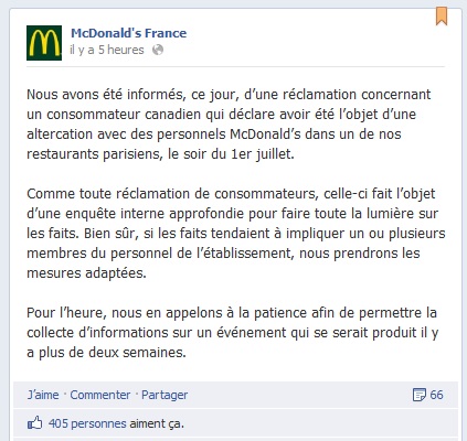 Il y a un peu plus de deux heures, la direction de Mc Donald’s ont eu vite vent de l’affaire et ont déclaré via Facebook :