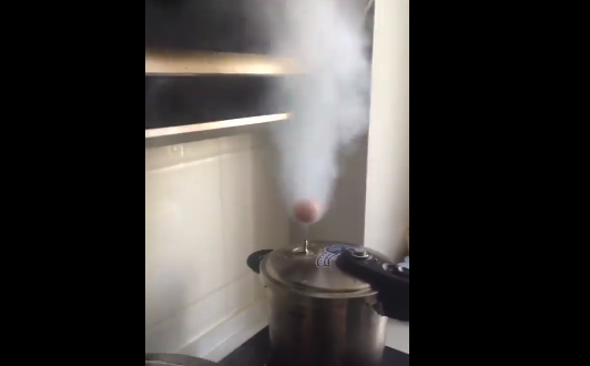 Une personne nous montre comment faire un œuf vapeur avec une cocotte-minute. Il suffit de placer l’œuf sur le jet de vapeur qui sort de la valve !