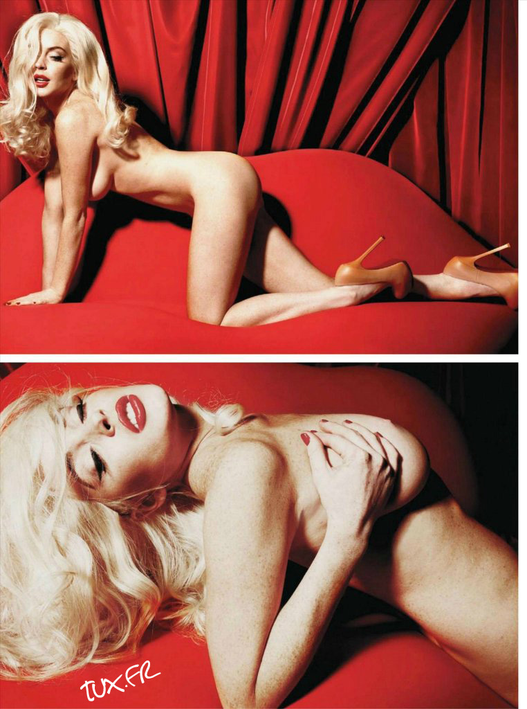 On peut donc voir la célèbre actrice Lindsay Lohan totalement nue qui aurait toucher un million de dollars pour le shooting (et certainement un million de mec vont se toucher). Après, est ce pour se montrer, par défi, pour renflouer les comptes en banque qui ont pris un sacré coup suite à ses déboires judiciaires ou juste pour se racheter un peu de coke ? Allez savoir… Elle est quand même bien foutu et a une belle paire de seins la rousse de la petite coccinelle !