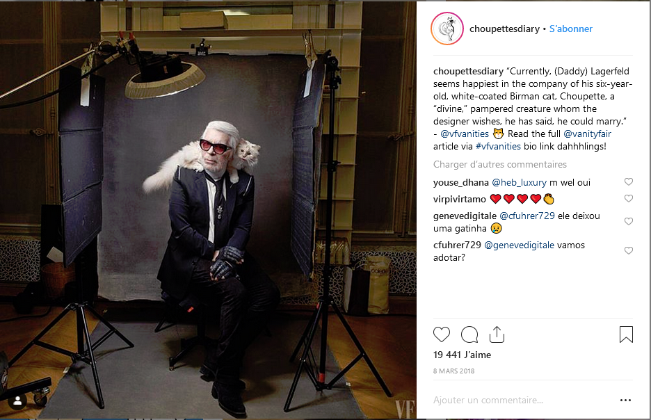 Très attaché à son chat, Karl Lagerfeld disait « Elle reste en permanence à mes côtés et elle a deux domestiques en permanence avec elle : elles jouent avec elle, s’occupent d’elle, lui brossent ses magnifiques poils blancs, lui donnent ses produits de beauté pour les yeux, expliquait Karl Lagerfeld dans un livre paru en 2014, intitulé « Choupette, la Vie Enchantée d’un Chat Fashion » . Elle est le centre de mon monde. Elle a quelque chose d’inoubliable, dans sa façon de se mouvoir. Elle inspire par son élégance et son attitude. ».