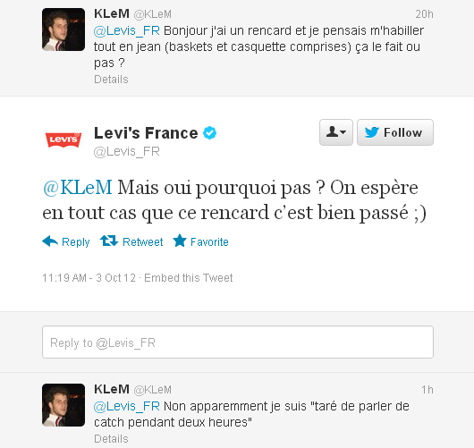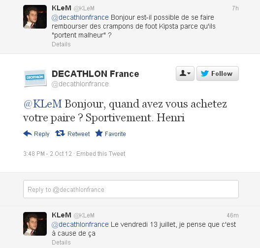 Ils ont la charge de répondre à vos propres questions ou problèmes (exit le mail ou le téléphone) directement sur Twitter. On en voit pas mal, même moi j’ai eu affaire à eux. Et même si des fois ils répondent sérieusement, parfois ils ont de l’humour. Alors @KLeM a réagit en premier en postant sur Twitter des demandes déjantés aux différents SAV et a attendu leurs réponses.